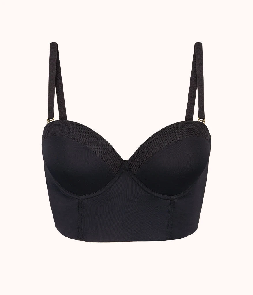 Our long-lined low back strapless bra offers total freedom to show some back. Delicate boning and flexible underwire make it structured enough to rock on its own or perfect as a strapless bra for a low back dress or top. Romantic, sexy, and cool, but still a comfortable corset bra. Hide or show. Support, always with the “no-slip” silicone strip at the top and removable straps.